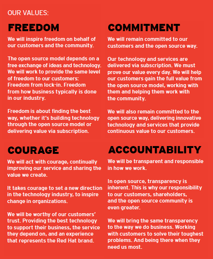 The values team was made up of a cross section of folks from across Red Hat: Sean Witty, who did biz dev and M&A; Mark Cox, a security guru who is still at Red Hat; Jeremy Hogan, one of the original Red Hat community managers but who at the time was working in support; Paul Salazar, who I’ve written about before in this blog here; Jonathan Opp, who is still in the Red Hat brand team and did a lot of the original writing of the values descriptions; and myself.