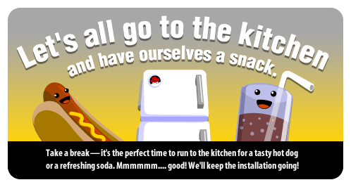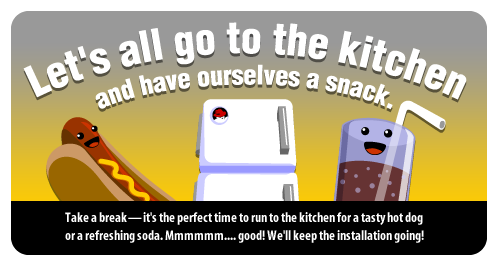 So faced with an increasingly corporate installation experience, we decided to bring some of the fun back into the installer and had our designer at the time, Kyle Hoyt, a brilliant illustrator, create some installer screens that evoked the experience of the interstitials at the movie theater. Here is the result:
